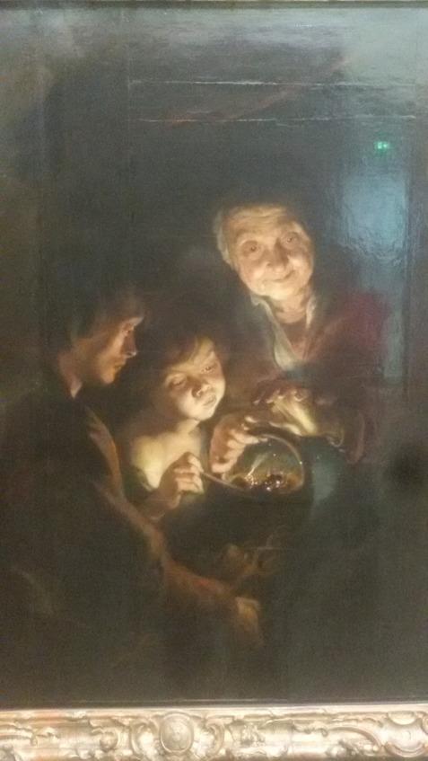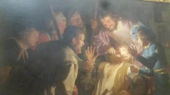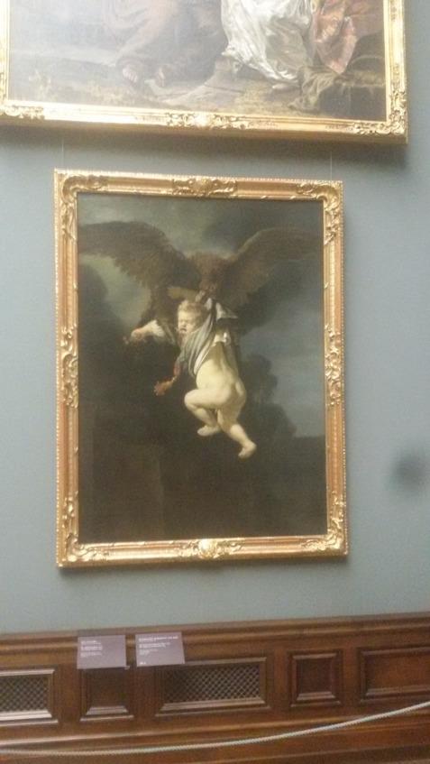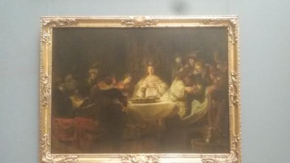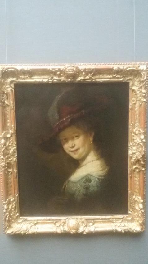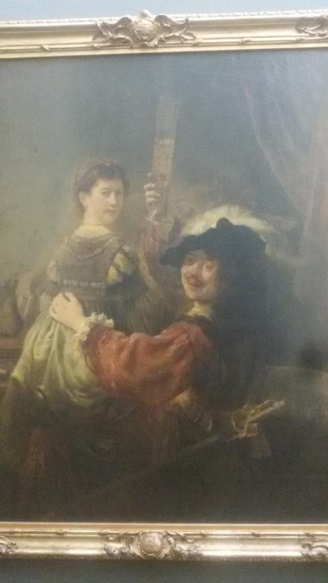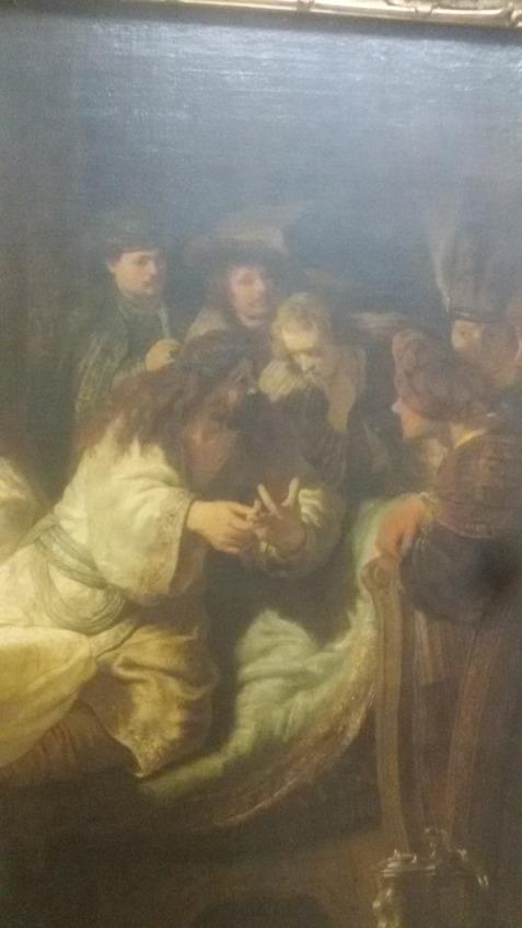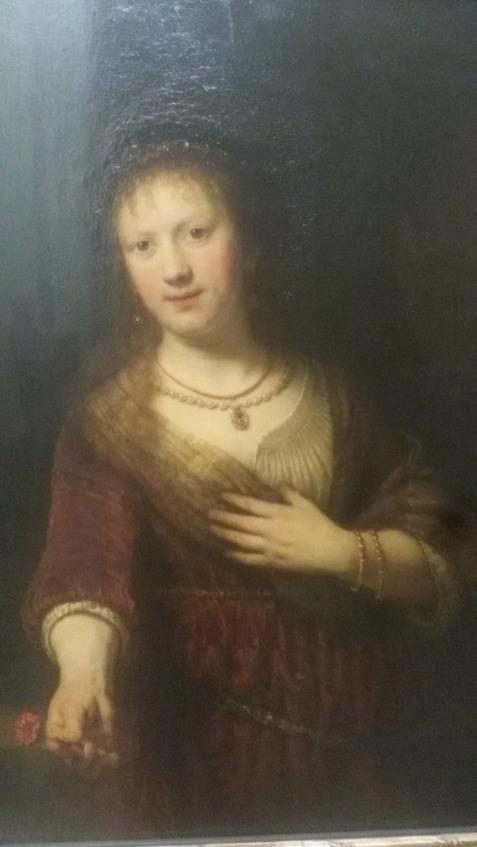 Перед нами –Рембрандт периода молодости и расцвета, молодой и исключительно одаренный художник, пока еще не нашедший своего неповторимого почерка, сделавшего его гением 17 века, следующий принятым для эпохи канонам и стилю живописи. Конечно, мы узнаем Рембрандта — удивительно глубокого портретиста, совершенно владеющего палитрой и линией, передающего драматическую наполненность сюжета и характеры персонажей, мы узнаем его тягу к глубоким, темным тонам, его удивительную способность создавать богатое для взгляда изображение, пользуясь одними лишь многочисленными оттенками глухих тонов бежевого, столь отличающее его в поздние годы умение светом раскрывать смысловую наполненность сюжета… Но перед нами — молодой Рембрандт, признанный талант, всеобщий любимец и баловень судьбы, счастливый муж, влюбленный в красавицу жену… он еще пишет в рамках предпочтений времени, вмещая в них колоссальный талант, его еще не смущает линия, и если бы не иные тематические и гаммовые предпочтения, не так уж много бы отличало его полотна от полотен соседствующего с ним залами Ван Дейка. Еще не погибла трагически Саския, и посреди праздника счастливой и творческой жизни, ему еще не открылась трагедия Судьбы и Бытия человека… он еще не начал искать, придя к поражающей последующие столетия способности превращать линию в иллюзию, в игру тонов и светотени, лишать предметы и фигуры устойчивых очертаний и писать многослойно, достигая этим почти мистической глубины изображения — визуальной, эмоциональной, смысловой… В этих поисках он еще не стал отверженным вкусами эпохи, разорившимся неудачником, познавшим дно и официальное признание его сумасшедшим… Его персонажи еще не обрели той философской и нравственной глубины, которая так характерна для них в работах зрелого и позднего периода, он еще не наслаждается красотой и смыслами старости, его картины еще не пронизаны поэтикой и величием страдания, духовной глубиной чувств… Перед нами — молодой Рембрандт, еще не загадочный и трагический гений, а просто очень талантливый художник, даже не подозревающий, какая судьба ему уготована…