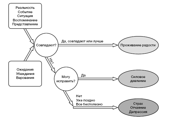 Как видите, эмоция является результатом сравнения какой-то новой ситуации (Реальность) и наших идей или ожиданий на этот счет.