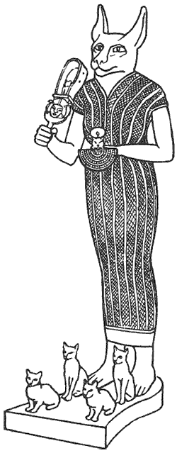 Во главе тех богов Древнего Египта, кому специально была посвящена кошка, стоит великая богиня Баст, или Убастет, известная также как Бубастис и Пушт, – вторая из божественной триады Мемфиса, возлюбленная и постоянная спутница Ра. Она, по всей вероятности, первоначально была чужой богиней, но в очень ранние времена стала отождествляться с женской половиной богов солнца: Пта, Ра, Осириса и Тема. В ее персонификации мы можем увидеть некоторые черты Исиды, которая, как и луна или кошка, воплощавшая луну, особо почиталась в городе, названном в честь Бубастис – Абу-Пушт, город Пушт. Здесь с незапамятных времен поклонялись Баст и кошек, воспринимавшихся жителями как ее символ, оплакивали после смерти и считали священными животными.