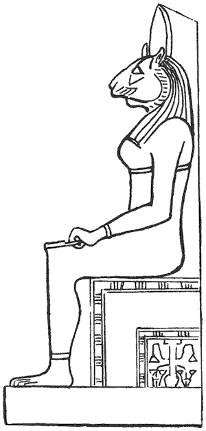 Другая колоссальная статуя Баст увенчана головой кошки. Она шесть футов высотой и стоит на диске и постаменте. Она увековечивает имя Шишанка, раннего египетского царя, упомянутого в еврейских манускриптах. Он правил в Бубастисе, который был столицей этой части Египта в период еврейского Исхода, как во времена Моисея, так и после него. Позднее Шишанк сделал себя главой Фив и царем всего Египта. Он боролся против Ровоама, царя иудейского, примерно в 956 г. до н. э., как записано в Третьей книге Царств, где говорится, что «он забрал сокровища из дома бога и сокровища из дома царя; он забрал все». На стенах храма в Карнаке среди покоренных народов упомянуто и царство Иудейское. Представляется, что именно Шишанк присвоил Баст титулы «плачущая» и «дающая».