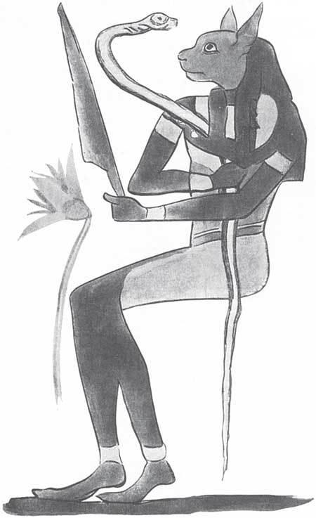 В этой цитате мы находим правителей с кошачьими лицами, отвечающими в определенном чертоге за наказания и живущими в теле окружающего мир змея тьмы. Кошка и змея работают в гармоничном единстве, чтобы осуществить месть Ра.
