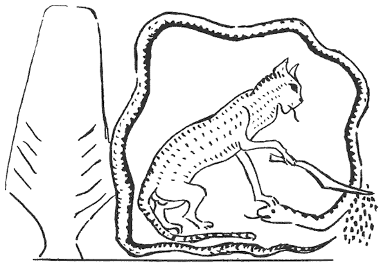 Глава XXXIII Книги мертвых направлена против Апопа, которого там зовут Ререк, теряющего свою силу перед лицом умершего, если он только упомянет имя Сепа или Шу. Умерший приказывает Ререку стоять, обещая ему съесть крысу, вызывающую отвращение у Ра, и кости «грязного кота». «Эй ты, змей Ререк, не двигайся. Смотри на Сепа и Шу. Не шевелись теперь, и ты будешь есть крыс, которые так отвратительны Ра, и ты будешь грызть кости этого грязного кота». А так как кот был эмблемой Ра, в этой роли он является убийцей змея тьмы, то трудно объяснить значение этого текста, если только мы не согласимся, что умерший человек надеялся обезоружить лестью врага, которого он не мог одолеть силой. Он не только обещает, что змей будет пожирать Кота-Солнце, но и то, что он будет есть крыс, которыми кот питается. Темнота будет проглочена как солнце, и серые тучи станут его добычей.[6]