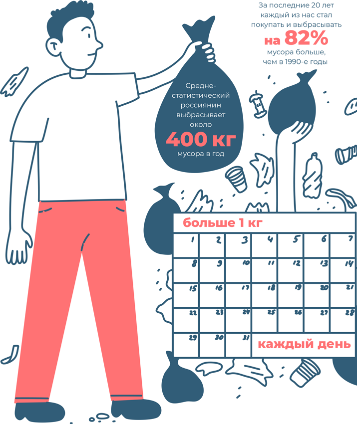 Среднестатистический россиянин выбрасывает около 400 килограммов мусора в год [1], то есть больше килограмма каждый день. За последние 20 лет каждый из нас стал покупать и выбрасывать на 82% мусора больше, чем в 1990-е годы.