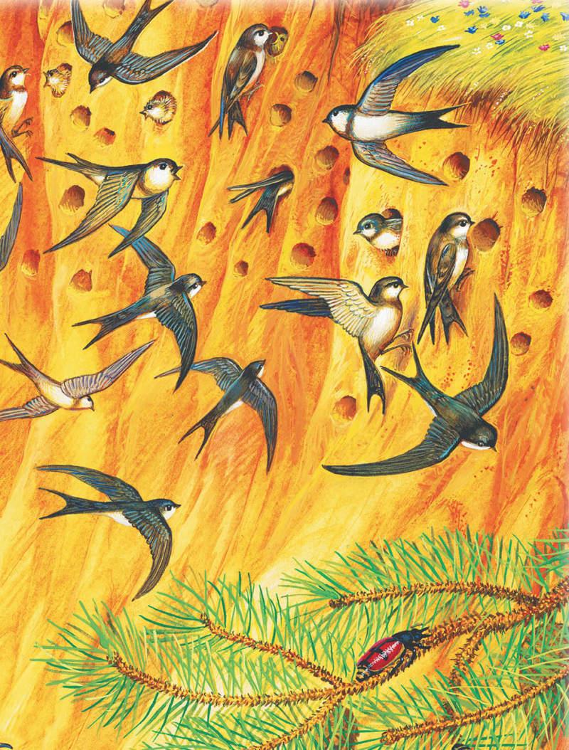 – Мед-ве́дь! Мед-ве́дь и-дёт! – за-кри-ча́-ли пе-ре-пу́-ган-ны-е ла́с-точ-ки–бе-ре-го-ву́ш-ки, стре-ми́-тель-но про-но-ся́сь над ре-ко́й.