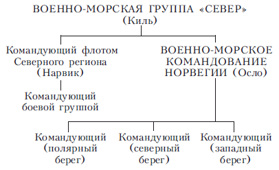 Военно-морское командование Норвегии отвечало за все вопросы, касающиеся Норвегии как базы военно-морских операций. В его функции не входило оперативное управление стоящими на базах кораблями, а только строительство и эксплуатация береговых мощностей, оборонительных сооружений, минные заграждения и траление мин. Ему подчинялись три командующих, за каждым из которых была закреплена определенная территория: полярная, северная и западная. Оперативное управление шло по цепочке от штаба в Берлине через группу «Север», командующего флотом северо-восточного региона к командиру боевой группы. Такая громоздкая организация оставалась в силе до марта 1943 года, когда была ликвидирована должность командующего флотом этого региона, а его функции по управлению флотом перешли к группе «Север». В мае 1944 года была упразднена группа «Север», и оперативное управление флотом стало осуществляться военно-морским командованием Норвегии. Командующий флотом региона отвечал не только за оперативное руководство кораблями своей группы, но также работал с подводными лодками, находящимися в его регионе, и осуществлял взаимодействие с авиацией. Военно-воздушное командование в Норвегии, которому суждено было сыграть важнейшую роль в судьбе арктических конвоев, называлось «Люфтфлотте V». В него входили три подразделения: северо-восточное, северо-западное и лофотенское, со штабами, соответственно, в Киркенесе, Тронхейме или Ставангере и Бардуфоссе. Таким образом, за исключением Киркенеса, где также был штаб одного из флотских командующих, военно-морские и военно-воздушные штабы территориально располагались довольно далеко друг от друга. Группа морских ВВС, куда входило небольшое количество гидросамолетов «Не-115», подчинялась военно-воздушному командованию, как и все самолеты, действующие совместно с моряками. Любая информация поступала в соответствующее ведомство ВВС, а там уже решали, какую ее часть можно и нужно передать морякам. Вот как были организованы противоборствующие стороны в преддверии грядущих сражений.