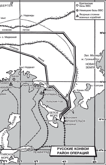 Существовало три маршрута, по которым можно было доставить эти грузы: из США через Тихий океан во Владивосток, а оттуда по транссибирской железной дороге в европейскую часть СССР; через Персидский залив в порты Хормуц и Басра, дальше наземным транспортом; или из Великобритании, а позже из Исландии в Мурманск. Последний из перечисленных маршрутов был самым коротким, но наиболее опасным, потому что противник мог легко обнаружить большие конвои торговых судов с воздуха; только иногда погодные условия ухудшались настолько, что самолеты-разведчики были вынуждены оставаться на базах. Немцы организовали не менее шести аэродромов на севере Норвегии, два из которых, как я уже писал, были очень близко к Мурманску. Поэтому в дополнение к атакам в пути суда могли (зачастую так и происходило) подвергаться нападениям после прибытия. Имея базы подводных лодок в Бергене и Тронхейме, немцы без труда организовывали патрули на возможных маршрутах конвоев. Кроме того, при желании противник мог использовать свои тяжелые корабли для перехвата торговых судов, особенно на заключительной части маршрута, когда суда проходили к востоку от линии, проведенной от южной оконечности Шпицбергена через остров Медвежий к мысу Нордкап, – здесь нам было очень трудно обеспечить их защиту. Конечно, во время войны грузы следовали в СССР по всем трем маршрутам, но в этой книге рассмотрен только один из них – арктический.