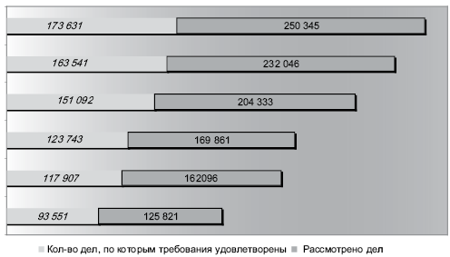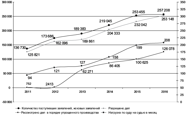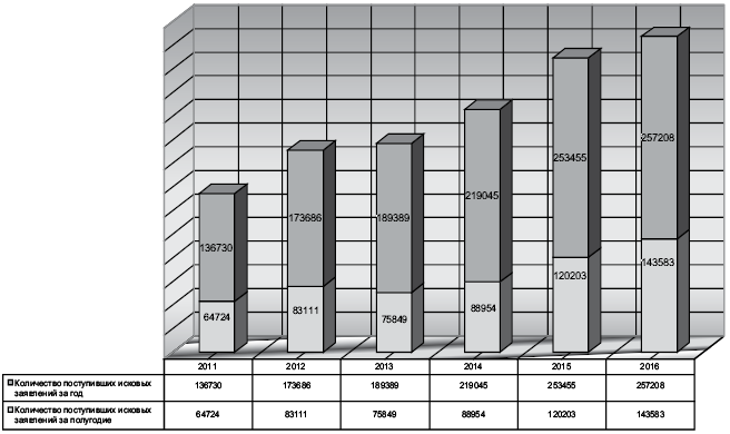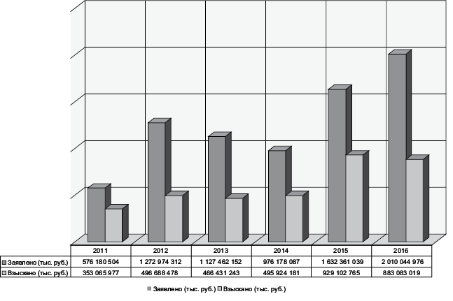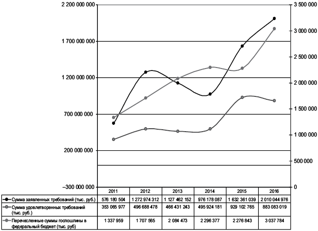 Так, сравнительные статистические данные работы Арбитражного суда г. Москвы за период с 2011 по 2016 г. (относительно заявленных и взысканных денежных средств) составляют следующие показатели: