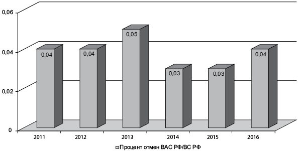 Важно обратить внимание на то обстоятельство, что высокий показатель отмен в 3,8% в действительности включает в себя отмены судебных актов первой инстанции, в том числе ввиду заключения сторонами мирового соглашения либо отказа истца от иска на стадии рассмотрения дела судом апелляционной инстанции.