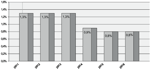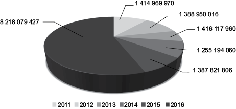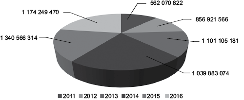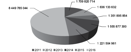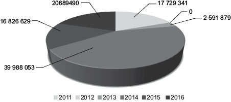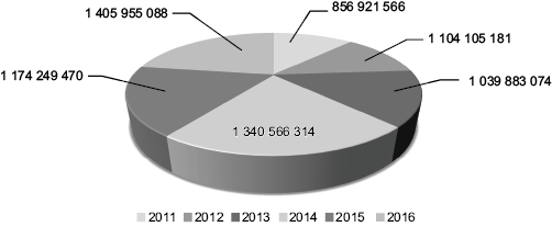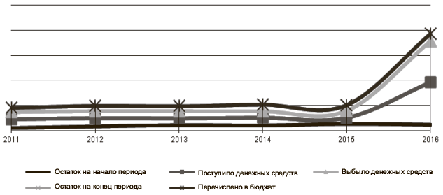 Таким образом, если на конец 2011 г. остаток средств составил 856 млн руб., то уже только на конец 2016 г. остаток составляет 1 млрд 405 млн руб. В бюджет в 2016 г. перечислено около 20 млн руб. Общая сумма поступивших денежных средств на депозитный счет (оборот) с 2011 по 2016 г. составила порядка 15 млрд руб.