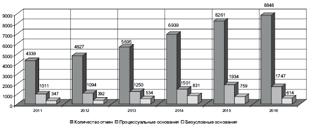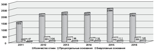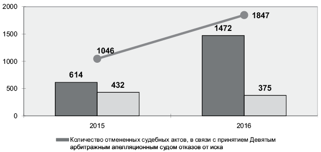 Кроме того, высокий процент апелляционных отмен в 2016 г., в частности в связи с отказом от иска, обусловлен выявлением недобросовестных юристов («автоюристов»), использующих юридические схемы в целях наживы5.