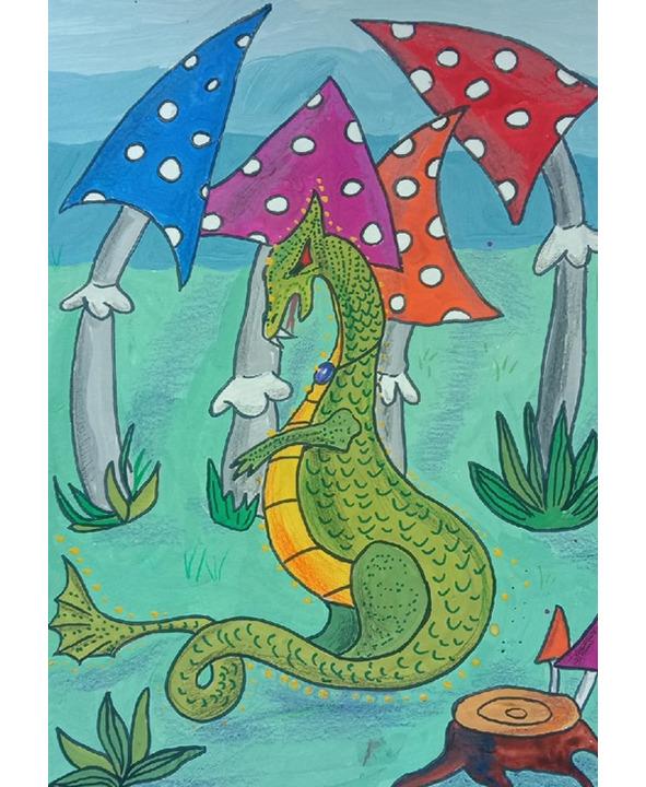 Человечки прошли через еловый лес и спрятались на опушке. Перед ними предстала Мухоморная поляна. Это было целое ядовитое царство. Огромные мухоморы самых фантастических цветов росли здесь повсюду. Путники увидели и обычные красные мухоморы, и оранжевые. А среди них были также мухоморы с фиолетовыми, зелёными, розовыми, голубыми и даже чёрными шляпками. Воздух отравляло неприятное зловоние. Огромные комары угрожающе пищали, мохнатые пауки таращили свои глаза со шляпок ядовитых грибов.
