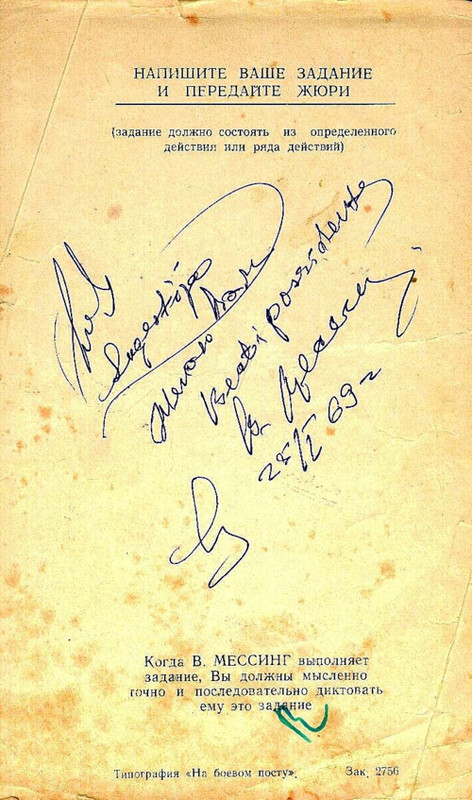 По-русски Вольф Мессинг говорил не важно, но я ловил каждое слово великого гипнотизера. Мы говорили о тайнах гипноза, телепатии и внушении наяву, а когда пришло время прощаться, Вольф Мессинг на фирменном бланке оставил автограф и сказал, что я стану известным человеком, после того, как брошу медицину.