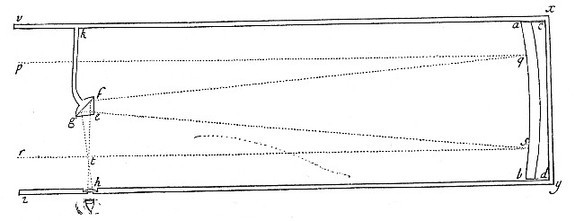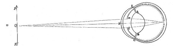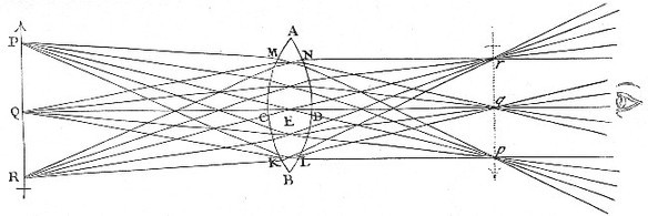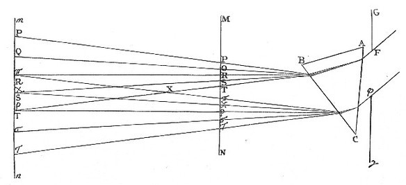 So if PR [in Fig. 3.] represent any Object without Doors, and AB be a Lens placed at a hole in the Window-shut of a dark Chamber, whereby the Rays that come from any Point Q of that Object are made to converge and meet again in the Point q; and if a Sheet of white Paper be held at q for the Light there to fall upon it, the Picture of that Object PR will appear upon the Paper in its proper shape and Colours. For as the Light which comes from the Point Q goes to the Point q, so the Light which comes from other Points P and R of the Object, will go to so many other correspondent Points p and r (as is manifest by the sixth Axiom;) so that every Point of the Object shall illuminate a correspondent Point of the Picture, and thereby make a Picture like the Object in Shape and Colour, this only excepted, that the Picture shall be inverted. And this is the Reason of that vulgar Experiment of casting the Species of Objects from abroad upon a Wall or Sheet of white Paper in a dark Room.