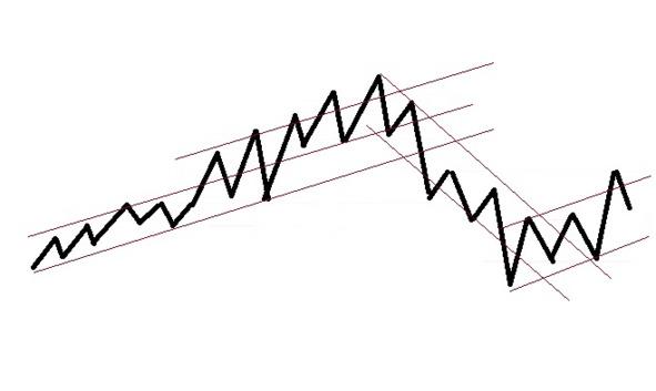 Канал подобен линиям тренда, но строится минимум по трем точкам. Например, по двум вершинам и одному низу. И наоборот. Когда цена бултыхается внутри канала, наглядно видно, куда она идет.