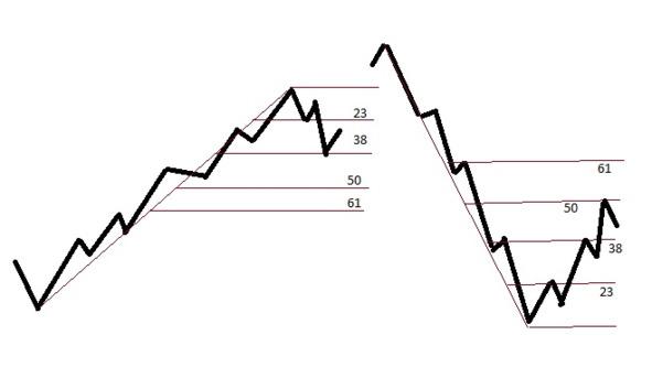 Так же используются уровни Фибоначчи. На восходящем движении строим от минимума к максимуму движения. На нисходящем наоборот: от максимума к минимуму. Подход цены к уровням дает нам сигналы отбоя цены для возможной коррекции.