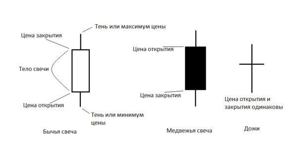 Свеча представляет собой прямоугольник, который именуется телом. Тени свечи — это черточки сверху и снизу. Одна сторона прямоугольника — это цена открытия, а другая — закрытия. Тени, нижняяи верхняя, обозначают, куда максимально выстреливала цена. Тени еще называют волосами (верхние) и хвостами (нижние), хотя можем для простоты все называть хвостами и их телами. Таким образом, визуально видна цена открытия, закрытия и внутридневные максимальные колебания — тени, или максимумы и минимумы.