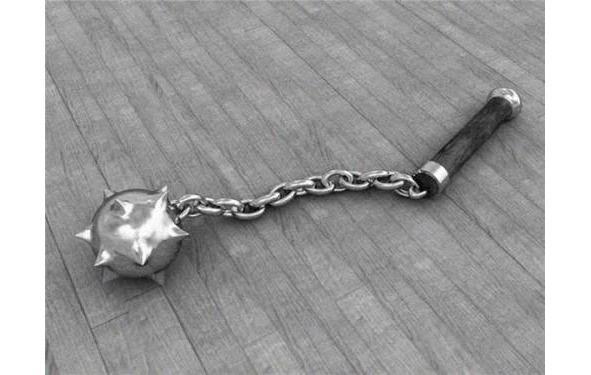 Круглый щит на левой руке, небольшой гладкий шлём, кольчуга — безрукавка, за поясом плётка со свинцовым шаром, вплетённым в конец и ятаган в ножнах.