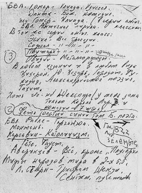 На квартире журналиста Игоря Дудинского скопище народа: выставка неофициальных художников и игра в «путаницу». По кругу ходит лист бумаги. Каждый пишет, что хочет и, загнув текст на обратную сторону листа, оставив последнюю фразу, передает написанное соседу. Являюсь с опозданием. В комнате лишь одно свободное место на низкой лавочке у незнакомого мне мужчины. Он непрерывно курит «Беломор». По ходу игры мой текст переходит ему: «В сумасшедший дом он попал по блату». Когда лист обошел несколько кругов и всё зачитали, он обратился ко мне: «А у нас с вами получился очень плавный переход». В перерыве художник Валера Черкашин сообщил: «А я тебя сфотографировал с Веничкой Ерофеевым». Так значит это Ерофеев?! Знала бы раньше, придумала бы что-нибудь поинтереснее. В разговоре с Ерофеевым спросила: «А над чем вы сейчас работаете?» Ответил, что заканчивает «Вальпургиеву ночь», что действие пьесы происходит в дурдоме. «А что вас натолкнуло на этот сюжет?» Рассказал, что не так давно пребывал в «Кащенко», наблюдал, как на 1 Мая для больных мужского и женского отделений устроили вечер танцев – первое, что и натолкнуло.