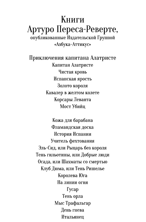 В этой книге перемешались любовь, патриотизм, война, солдаты, приключения — и она неизбежно понравится и давним поклонникам Артуро Переса-Реверте, и тем, кто до сего дня еще не открывал ни одного его романа.