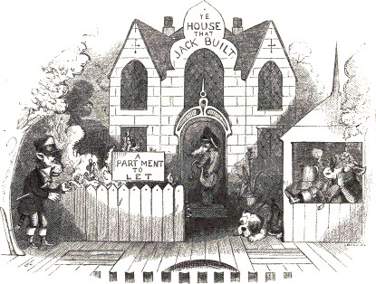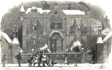 ERY cold, very bleak; the thermometer and snow are falling fast; eggs and suet are rising faster; everything at this season is “prized,” and everybody apprizes everybody else of the good they wish them,—“A Merry Christmas and a Happy New Year!” Even the shivering caroller, for “it is a poor heart that never rejoices,” is yelling forth the “tidings of comfort and joy.” The snow that descends, making park and common alike—topping palace and pigsty, now crowns the semi-detached villas, Victoria and Albert. They were erected from the designs of John Brown, Esq. and his architect (or builder), and are considered a fine specimen of compo-cockney-gothic, in which the constructor has made the most of his materials; for, to save digging, he sank the foundation in an evacuated pond, and, as an antidote to damp, used wood with the dry-rot—the little remaining moisture being pumped out daily by the domestics. The floors are delightfully springy, having cracks to precipitate the dirt, and are sloped towards the doorways, so that the furniture is perpetually trying to walk out of the rooms; but those apertures are ingeniously planned to prevent the evil—the doors obstinately refusing to open at all, without force. That the whole may not appear too light, few windows are introduced. By casual observers the Victoria and Albert would be taken for one—so united are they; and had we not seen the parting division, we should have doubted also. Of the entrance lodges, we have noticed one of the chimneys smoking periodically; and, from the mollient white vapour issuing over the window at such times, presume Victoria is washing, whilst Albert is locked up and doing nothing.