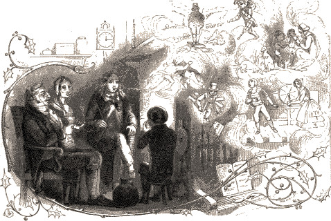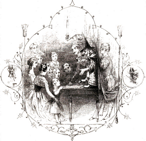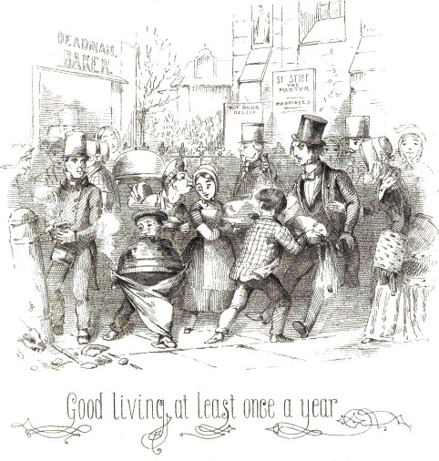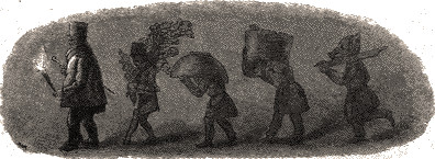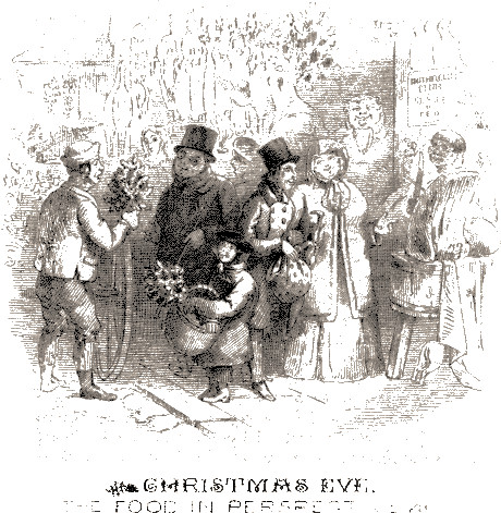 He ties a handkerchief round his foot to prevent slipping; and has something “short” to keep out the cold; and a little brandy-punch to keep out the fog; and a little egg-flip to keep him warm; and a link that he may see the way, for his vision is not very distinct;—his head is delightfully buoyant, his optics inclined to multiply, and his legs very refractory, having a great desire to dance or go sideways, but obstinately refusing, in their eccentricity, to proceed in a straight line; for Mr. Brown is more merry than particular—taking Newgate Market in his way home to Mizzlington from the ’Change. Having a great veneration for old customs, he buys a boar’s head there and boy to carry it; next, being taken with a crockery-shop-sign, “The Little Bason” (which, by-the-bye, was a very large one), he purchases that also, thinking it will do for a wassail-bowl; likewise some holly; and an old butcher’s-block to serve as the yule-log; not forgetting the last new Christmas book of sympathy and sentiment, “The Black Beetle on the Hob,” a faery tale of a register-stove,