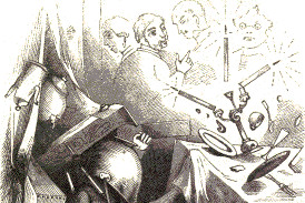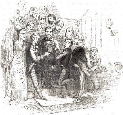 But here we will leave Mr. Spohf’s reverie—for Victoria and reality; where the company is arriving to the annual dinner, and sitting about the drawing-room, looking as happy as patients at a dentist’s; or festive, as disappointed toadeaters at the funeral of an opulent relative, who had left all his property to found an asylum for decayed postboys—after leading everybody to expect the lion’s share of it:—the guests, for want of more exciting topics, admiring the gimcracks they admired a year ago; thinking the portrait of Mr. Brown—“done,” twenty years since, at a portrait club,—a splendid likeness, and that the original grows younger (query, richer?); stating truths and untruths about the weather; inquiring energetically after each other’s health—not caring for the answers; with other homely pleasantries, too numerous to mention; until some of the juveniles—the only ones who really seem at home—espy from the window a loaded parcel-cart; this they observe as funny on a Sunday (little thinking, at that moment, it was Tuesday). Here Mr. Brown descends, to hold an altercation with the guard of that cart, who makes light of a huge hamper of game; whilst the guests at the windows above, speculate upon having to eat an uncooked turkey, or fancy their ravenous appetites waiting while it is cooked—the youngsters calculating upon a dinner all pudding. Mr. Brown returns, and tenders his arm to Lady Lucretia de Camp—in the excitement, leading her down the side where the stairs taper to nothing,—causing that lady to lose both equilibrium and temper.