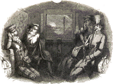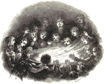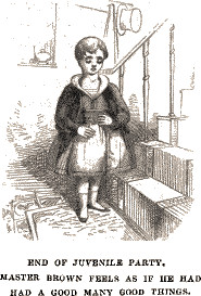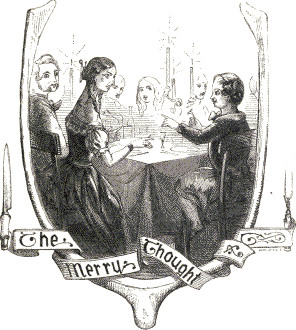 In the hall they are introduced to the viands, all thought to partake of;—which have arrived too late, and are now displayed in their primitive state—a picture of still life; whilst the guests—a picture of disappointment—have to put up with odds and ends, concocted to meet the emergency, ending with a series of plum-dumplings, in place of the legitimate large pudding. However, the indigent relatives, who prefer the cold corners, and take “any part,” declare themselves well satisfied:—all partaking of everything, and brandy afterwards, as if the viands were rich. Master Brown does justice to everything, of course—that sweet child is now pulling the merry thought with his maiden aunt; he is victor, and, as no one wishes to know his thoughts, seems determined to tell them,—wishing “Jemy. and Mr. Latimer would look sharp, and knock up the match Mamma spoke of; as then he should be breeched, have pockets, and money:” here the little dear turned to the Captain, saying, “You’ll give me a crown, won’t you?”—a question at which the maiden aunt blushed intensely, as did Mrs. Brown, who attempted to hide her emotion by saying, “What strange things children do think of!”—at the same time helping a gentleman who had had enough—the bashful gentleman, who sat at the junction of the tables, and appeared so incommoded by the table-land of one being higher than the table-land of the other—causing his plate to oscillate in a very remarkable manner, and discharge its contents in his lap,—the conjoined legs compelling him either to sit at a fearful distance, and spill the gravy, or to split his kerseymeres, by extending them too much for their frail make:—however, he has at last succeeded in thrusting one knee between them, and the shorter leg of the two off Bunyan’s “Pilgrim’s Progress”—used to stilt it;—letting the unfortunate gentleman’s pudding down, and his plate travel, until at last it stops, performing a gyration, all to itself, under the sideboard.
