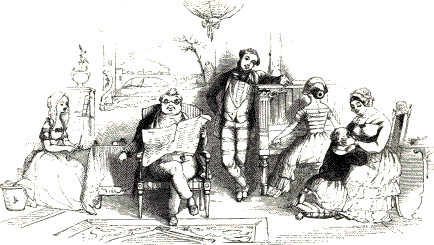 Their lord and master is John Brown, Esq., Director of the Deptford Direct, the Stag Assurance, and Churchwarden of this parish—St. Stiff the Martyr,—a portly upright man; for had he not been so erect, to balance a “fair round belly,” he would have toppled on his nose. Everybody said that he was clever, too—and, moreover, always thought so; for luck had made our friend a rising man amongst the suburban aristocracy of Mizzlington. Of Mrs. Brown, she is his match, and portly too; though older and more crusty—a crummy dame, to whom her lord must bow; for, upon his hinting at duty, and an obedient wife’s commanding her husband, she ordered him off, reading the adage as a woman ought. Of the Misses Brown, Jemima and Angelina, they are decidedly getting old—for young ladies, having been “out” for some time; and, like the back numbers of an old periodical, are not the more interesting or marketable for it. Of the sons, the elder, John Brown, jun., is spoiling himself by patronising all that is “fast;” whilst the younger is being educated for a faster age, being spoilt first by his mother.