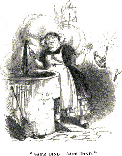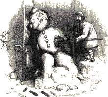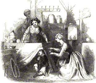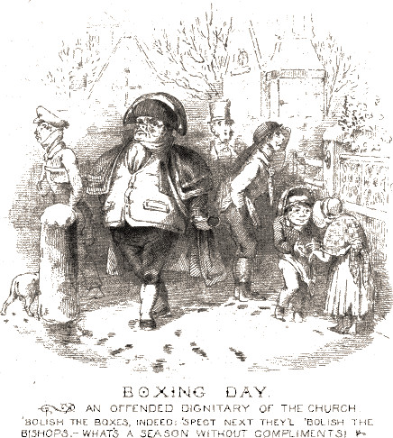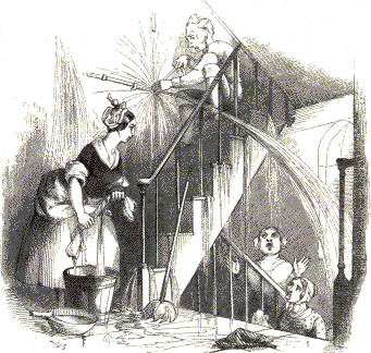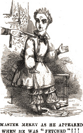 The 25th of December arrives.—The festival of the year has come. Christmas-day commences with the rising of the cook, who finished the evening, kneading and gaping over pies and puddings; and wakes with the same operation, gaping and kneading her eyes, which do not fairly open until she comes to look after her first care—the pudding:—the fire, having been made up over night, is discovered a “beauty;” but, behold,—within the copper, the pudding has dissolved!—there is nothing to be found but a cloth, which must have been boiling all night in a rich plum-soup,—the string having come untied; or rather, never been tied at all, but popped in by Mrs. B. without attending to that operation:—a piece of neglect, for which the cook gets “warning,” and all the servants rated—until the bells of St. Stiff’s remind Mrs. B. that it is time to depart, for the duties of a Christian, to eschew all the vanities of this wicked world, in a rich purple Genoa velvet paletot and duck of a plum bonnet. That day Mr. Churchwarden Brown’s pue would not hold all, so Mrs. Strap, the pue-opener, had to manœuvre by appropriating part of another to their use, losing her Christmas-box for the offence against its owner, Mr. Din, the copper-smith.