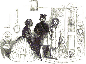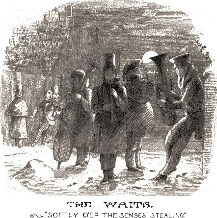 Mr. Spohf, the little organist, being perched up aloft, sees, through the curtain, the Christmas holly and the Captain—taking care to mark that individual with mental chalk. The musician’s eyes are in the Brown pue; but the eyes that used to meet them are turned another way—all favour is centred upon their spurious exotic, who grows thicker, twines tighter, and takes deeper root, the more he is encouraged:—of the species, or genus, we cannot do better than quote Mr. B.’s own words, written against December 23rd, Sunday—(whilst the Waits, as usual, were serenading the semi-detached, in a full conviction of its being Monday, and the possibility of “living and loving together,” and “being happy yet”).—“To church with my new tenant, who is delightful company: Lady Lucre. says he is a ‘refined duck,’ a ‘gentlemanly angel,’ and a ‘manly poppet:’ to which I made answer, that I thought so too; and that she was a ‘seraphine concert.’ Sermon, by the Rev. Loyalla à Becket, ‘in aid of funds for supplying the poor, during this inclement but festive season, with food for the mind.’ Captain de Camp did borrow a sovereign of me, to put in the plate; and I was told by my fellow-churchwarden, Mr. Flyntflayer, that he did put in a bad shilling, wrapt in paper, and did take out fifteen shillings in change:—this, I said was untrue—as, of course, it was;—having lent him a sovereign myself, for the express purpose. We are to have Captain de C.’s two noble sons here, during the holidays; one, I believe, comes from Oxford, and the other from Sandboys Military College:—now is the time—Jemy. and Angel. must be on the alert, for