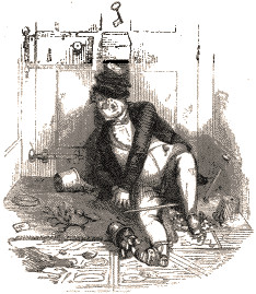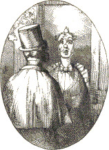 During this day the semi-detached is besieged by a lady and gentleman in search of a home. The gentleman, dressed in a very tight frock-coat, dusty and worn; a highly-glazed cap, the strap of which dangled above a tuft of hair, that graced his chin, its peak resting upon the tip of his nose, affording him little more than a view of his boots, with a portion of the hose protruding therefrom; his tightly-strapped trowsers carrying a broad stripe, of which he appeared proud, being engaged in the manufacture of many more in other parts, by knocking the dust out of them with a slight cane;