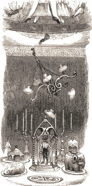 Mr. Spohf, having played all out of St. Stiff the Martyr, walks home moodily:—instead of finding his dinner as usual, the chop and potato, he learns that his landlord, Mr. Strap, the greengrocer, has stopped the supplies. It is quarter-day!—Strap thinks of the five weeks’ arrears, and Mr. Spohf’s inability to pay for his lodgings; so, Mr. and Mrs. Strap have surprised him, by preparing a huge leg of mutton and pudding; for they know he does not, as of old, go to the “Willer.” After this humble repast, which was relished as much as any could be, and was far less likely to leave unpleasant sensations than if it had been more costly, they draw round the fire; and master Ichabod Strap, one of the choristers of St. Stiff the Martyr, is playing with a shilling, polishing the coin upon his sleeve—it is the identical one said to have been put in the plate by Captain de Camp, and given by Mr. Flyntflayer (the gentleman who held the gothic platter) to Mrs. Strap, the pue-opener, advising her at the same time to nail it to the counter—a counterfeit to deter “smashers.” But, somehow, the coin seemed doomed to remain unholy, for no orifice or artifice could have rendered it a lucky one; it was shown to Mr. Spohf, who thought it bad, and that it might have gotten into the plate by mistake; Mrs. Strap knew it bad—an intentional perpetration,—and, like the giver, not worth a dump; Mr. Strap not only thought it bad, but proved it so; for, after having spun, sounded, and eaten a portion of it, he cast the coin into the glowing fire, where the silver quickly changed, dropping, like quick-silver, among the ashes, to be picked out by Ichabod, very unlike a sterling coin.
