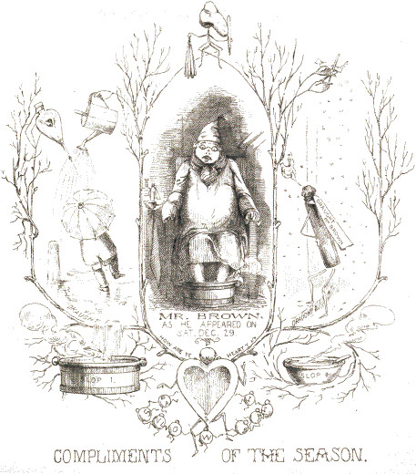 “December 21st, Friday.—Advertised in this day’s ‘Times,’ to let Albert, furnished, from the 25th, with use of servants, if required (double-house and household at half-price—grand effect united with economy). Tommy came home from Dr. Tortem’s, with holiday-letter, bill, and wonderful crop of hair—considering it costs me five shillings per quarter to cut; brimstone and treacle, under head—medicine, charged ten and six; firing and broken windows, two pounds; &c.:—what most unlucky things turn up on a Friday! I much wish I had not advertised Albert to-day—no one will come.” With these observations, and a consolatory grumble about Christmas coming but once a year, Mr. Brown seeks repose beside his consort; whilst the Waits make the lowing wind, the frigid vegetation, and the rattling shutters, dance again to the “Bridal Polka.”