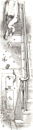 That evening Mrs. Brown’s rich mellow snore commenced later than usual—for she had been loud and long in the praise of their new neighbours. Mr. Brown making entry against December 22nd, Saturday.—That Albert was let:—whilst, the Waits were playing the “Phantom Dancers,” and Captain de Camp busy, there, screwing his empty trunk to the floor, that it might appear heavy, and full of valuables; and whilst, between the villas in the rear, there might be seen a glimmering candle, and by that light be found—one not unknown to Brown—a poor little musician, in a little second-floor room, containing a little organ much too large for it, and a litter of dirty soft papers,—who is not a little perplexed at a note, from Mrs. Brown, dispensing with his services:—he, the poor little music-master, more amiable than handsome, less symmetrical than serviceable;—who had, in less favoured times, contracted friendship, and to teach the Misses Brown music at thirty shillings per quarter—who had gotten so familiar as to love—had dared to offer that person Nature had deformed, with that mind Nature had adorned, to Miss Jemima Brown. There was a time when his anecdotes had been prized, and his long, delicate, white fingers kept playing to perpetual dancers; and that fine voice, Nature had bestowed in lieu of symmetry, sang the merriest and most sentimental songs for love:—the retrospect is too much for poor Spohf—so he seeks refuge in his organ, much to the annoyance of a little tailor in the attic, who has no soul in him—save the sole he had for supper.