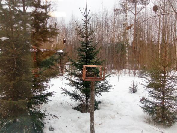 С местом, куда повесить кормушку особо не размышляли — за окном кабинета растут ёлки и сосны, вот там ей и место. Птицы будут к нам прилетать кушать и радовать нас своим щебетанием.