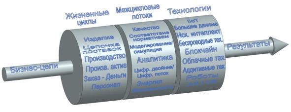 Модель MESA для умного производства объединяет три взаимосвязанные категории. На рис. 1.3 они показаны в виде трех барабанов, которые взаимодействуют между собой в процессах перехода от бизнес-целей к результатам производства [2]. Первая категория — это жизненные циклы (Lifecycles). Причем речь не только о жизненном цикле изделия (ЖЦИ). Жизненные циклы распространяются на все бизнес-процессы и потоки создания ценности, необходимые для производства. Концепция Smart Manufacturing призвана повысить связность и прозрачность во всех измерениях предприятия, влияя на жизненные циклы всех объектов и субъектов производственного процесса.