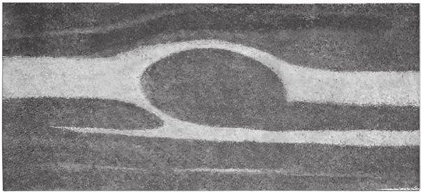 «Большое красное пятно» Юпитера, как оно видно было в 1889 г. в телескоп Ликовской обсерватории. (Рис. Килера.) Это загадочное образование, впервые замеченное в 1878 г., становилось с тех пор то резче, то слабее. В настоящее время оно почти слилось с окружающим его фоном