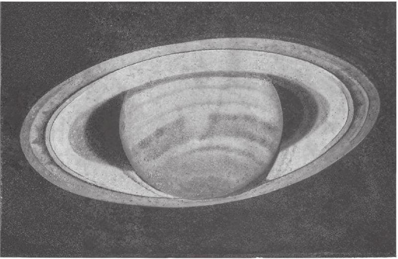 За 250 лет, протекшие со времен Гюйгенса, наши знания о сатурновом кольце значительно обогатились. Астрономы тщательно измерили его во всех направлениях, изучили его движение, а главное – определили его природу. Мы знаем теперь, что сатурново кольцо – не сплошное, твердое, а густой кольцеобразный рой мелких телец, вроде камешков или пылинок, быстро движущихся вокруг планеты, подобно тому, как обращается вокруг Солнца пояс планетоидов. Но, в отличие от последнего, крупинки в сатурновом кольце расположены гораздо теснее, гуще, так что издали собрание их производит впечатление сплошного тела и даже отбрасывает тень на поверхность планеты. Обломки распределены в этом кольце неравномерно: кольцо расщеплено круговыми щелями по крайней мере на три самостоятельных кольца, вращающихся одно в другом и отделенных друг от друга промежутками в тысячи километров. Ширина всех трех колец в пять раз превышает поперечник земного шара; толщина же их, довольно неравномерная, так мала, что кольца с ребра остаются невидимыми даже в сильнейшие телескопы. В среднем она, вероятно, не превышает ста километров. Значит, толщина колец меньше их ширины в тысячу раз, т. е. примерно во столько же, во сколько раз толщина страницы этой книги меньше ее ширины.