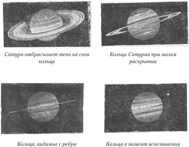 Телескоп открыл у Сатурна одну поразительную особенность, которая резко отличает эту планету не только от его близнеца – Юпитера, но и от всех других миров нашей системы. Особенность эта – загадочное плоское кольцо, свободно висящее вокруг планеты и окружающее ее наподобие полей шляпы. Благодаря этому кольцу, видимому для нас лишь сбоку, Сатурн имеет в телескоп чрезвычайно своеобразный вид. Когда 300 лет тому назад Галилей впервые направил на эту планету свою несовершенную трубу, Сатурн показался ему снабженным по бокам какими-то непонятными придатками, которые великий ученый принял было за самостоятельные планеты. «Это словно два служителя, поддерживающие старого Сатурна на его пути», – писал тогда Галилей. Долгое время странные придатки Сатурна оставались загадочными, – тем более, что нередко они таинственным образом исчезали. И только спустя полстолетия после первого наблюдения Галилея сильная труба Гюйгенса разъяснила наконец, в чем дело. «Сатурн окружен тонким плоским кольцом, не прикасающимся к нему и наклоненным к его орбите», – объявил Гюйгенс. Непонятная изменчивость формы кольца и периодические исчезновения его стали тогда вполне естественны. Во время 30-летнего странствования по обширной орбите Сатурн обращает к нам свое кольцо под разными углами – отсюда и различный вид его. Когда же это тонкое плоское кольцо становится к нам ребром, или когда оно освещается с ребра Солнцем, или же, наконец, когда обращает к нам свою темную, неосвещенную часть – во всех этих случаях оно делается совершенно невидимым. Подобные исчезновения кольца могут наблюдаться каждый год по несколько раз.