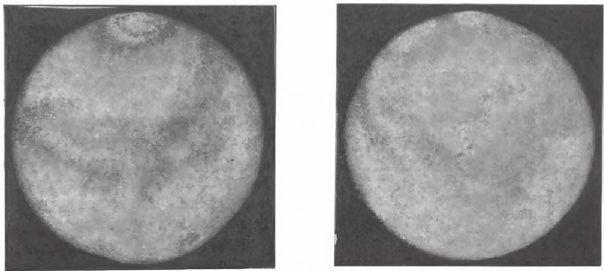 Вид Венеры в телескоп средней силы. Плотная атмосфера, окутывающая эту планету, отражает так сильно солнечные лучи, что сквозь нее не удается различить почти никаких подробностей самой почвы Венеры. Поэтому трудно подметить, во сколько времени эта планета обращается вокруг своей оси