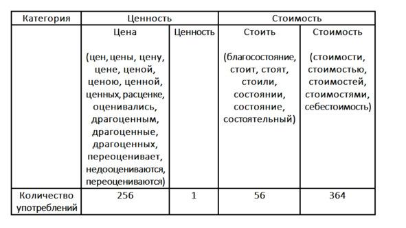 Отметим далее, что в общей сложности в основных для исследования вопроса о ценности Книгах 1 и 2 своей работы Адам Смит употребил слово «ценность» (и однокоренные — цена, оценка и т.д.) 257 раз и слово «стоимость» (и однокоренные — стоить, себестоимость и т.д.) — 420 раз. В таблице рисунка 2 «Количество упоминаний слов „ценность“ и „стоимость“» о таких упоминаниях представлены более подробные сведения.
