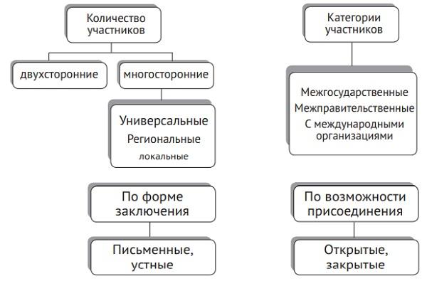 Особое значение приобретают договоры по оказанию правовой помощи, заключаемые с целью взаимного соблюдения и признания имущественных, личных неимущественных и процессуальных прав граждан одного государства на территории другого, для чего в их текстах обычно определены виды, формы и способы сотрудничества органов юстиции различных государств в области гражданского, семейного наследственного, трудового права92; торговые договоры, устанавливающие общий правовой режим для развития коммерческих взаимоотношений93, а также соглашения по охране авторских прав и промышленной собственности, перевозок грузов и пассажиров различными видами транспорта и др.