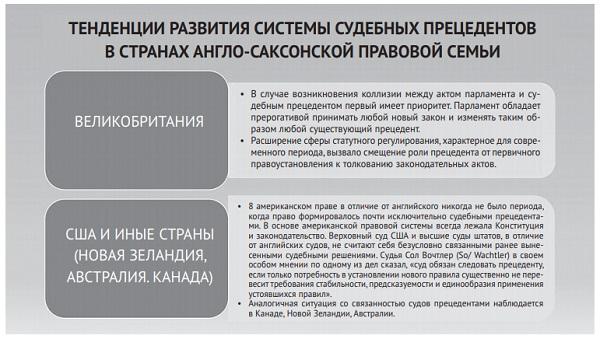 «Прецедент можно определять путем анализа нормативных фрагментов, образующих однотипное правило поведения, содержащееся в нескольких судебных решениях (…) — прецедентное правило». (…) Современный судья при вынесении нового решения непременно должен обратиться к той части судебного решения, которое носит название obiter dictum («попутно сказанное»), и использовать правила, в соответствии с которыми прежний судья выносил свое решение», (…) которому уже обязаны следовать будущие правоприменители»101. Подобные судебные правила имеют права создавать только высшие судебные органы англо-саксонской правовой системы. Таким образом, правило прецедента — это институт процессуального права, «процессуальная обязанность судьи следовать решениям предыдущих судей»102, а судебный прецедент — это система «норм и принципов, созданных и применяемых судьями в процессе вынесения ими решения»103.