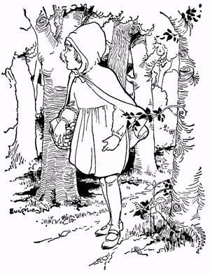 There was once a sweet little maid who lived with her father and mother in a pretty little cottage at the edge of the village. At the further end of the wood was another pretty cottage and in it lived her grandmother.