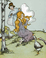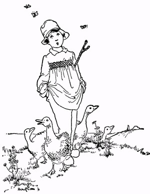 The boy was called little Conrad, and the real bride was sent with him to look after the geese. When they reached the meadow, the Princess sat down on the grass and let down her hair, and when Conrad saw it he was so delighted that he wanted to pluck some out; but she said—
