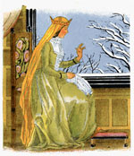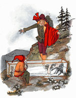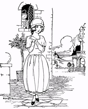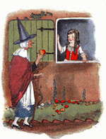 She decided that Snowdrop must die, so she dyed her face and dressed up like an old pedlar, and in this disguise she went to the home of the seven Dwarfs and called out, "Laces for sale."
