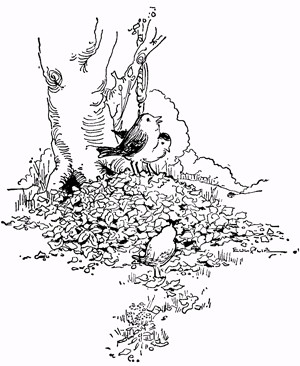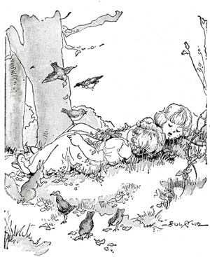 They wandered on and on until they became so tired and hungry that at length they sat down at the foot of a tree and cried as if their hearts would break. The little birds heard them and began to trill sweet lullabies, which presently lulled them to rest.