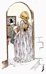There was great rejoicing when they arrived at the castle. The Prince hurried towards them, and lifted the Waiting-woman from her horse, thinking she was his bride. She was led upstairs, but the real Princess had to stay below.