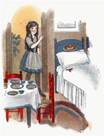 So she ordered one of her huntsmen to take Snowdrop away and kill her; but he was too tender-hearted to do this and left the maiden in the wood and went home again. Snowdrop wandered about until she came to the house of seven little dwarfs, and they were so kind as to take her in and let her live with them. She used to make their seven little beds, and prepare the meals for the seven little men, and they were all quite happy until the Queen found out from her mirror that Snowdrop was alive still, for, as it always told the truth, it still told her Snowdrop was the fairest lady in the land.