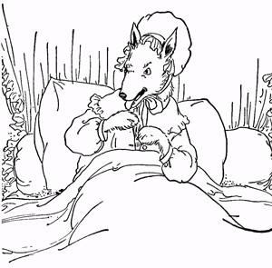 The wolf pressed the latch, and walked in where the grandmother lay in bed. He made one jump at her, but she jumped out of bed into a closet. Then the wolf put on the cap which she had dropped and crept under the bedclothes.